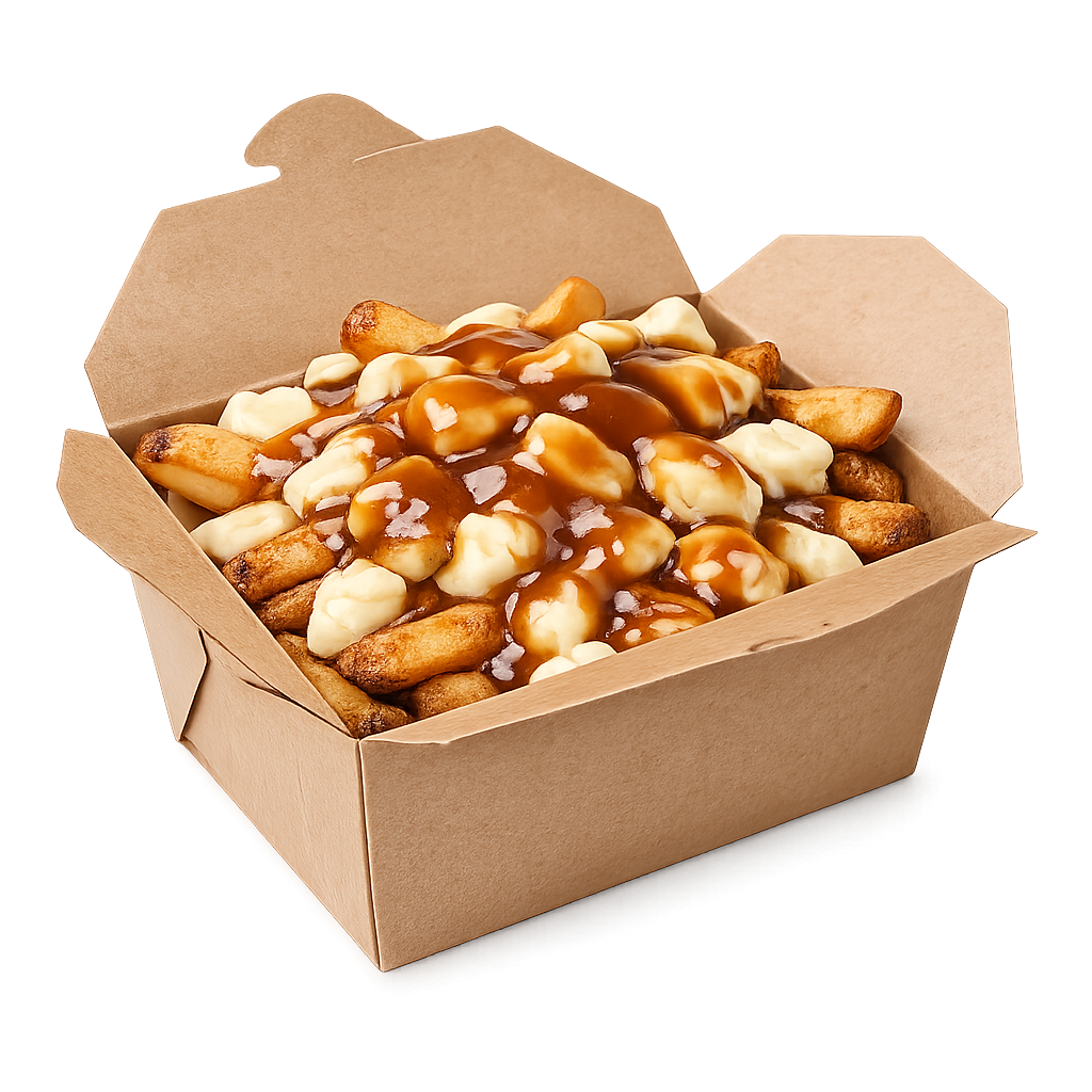 CLASSIC POUTINE with Vegan Gravy topped with crispy BEEF BACON
